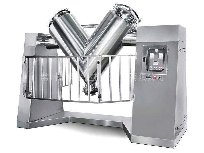 本設備利用混合機二圓柱筒長度不相等,行成不對稱,當混合機轉動時物料從分解到組合,從組合到分解,由于物料平面不同,也有橫向力,又推動物料進行橫向交流,每轉動一圈橫向力約使25%的物料從一個桶流向另一個桶,這樣物料橫向徑向混合,分解組合相互進行,使物料達到均勻的混合效果。